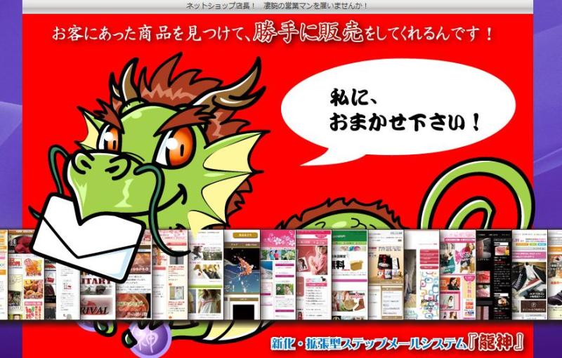設定をしてしまえばサイトに来てくれたお客様と対話をするように、お客様のニーズを探しだし適切な商品を紹介することで売上を伸ばし安定した収入を確保 してくれるシステムです!新化・拡張型ステップメールシステム『龍神』